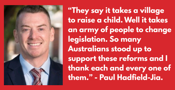 “They say it takes a village to raise a child. Well it takes an army of people to change legislation. So many Australians stood up to support these reforms and I thank each and every one of them.”